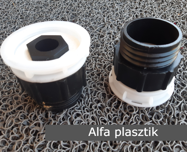 Átalakító sűrű menetes, S60-as (2"-os) és a speciálisabb, S62-es alsó kifolyóval rendelkező IBC tartályok alsó kifolyójához. Az átalakító az alsó kifolyóra történő rátekeréssel lehetővé teszi, hogy normál menetes szűkítőket, adaptereket csatlakoztathassanak a tartályokhoz, lehetővé téve tartályok összekötését, locsolótömlőre csatlakozását, stb.